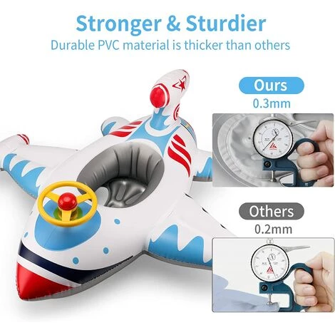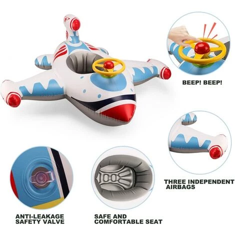 【FORME D’AVION ATTRACTIVE】La belle forme d’avion blanc initiera votre bébé aux joies de l’eau, Convient aux enfants de 1 à 4 ans.【CONCEPTION DE SÉCURITÉ UTILE】Trous de jambe lisses, durables et avec un excellent soutien à la flottabilité.Les ailes maintiennent l’équilibre des deux côtés, ne basculera pas.【Drôle】Venez avec un volant et un klaxon « BEBE »【MATÉRIAU DE HAUTE QUALITÉ】Durable et avec un excellent support de flottabilité et des soupapes de sécurité, une base lisse pour le confort【PRATIQUE À PORTER】Le flotteur d’avion gonflable est le jouet de piscine parfait pour l’été, gonflez et dégonflez rapidement, utilisez simplement une paille, facile à plier et à emporter en voyage.