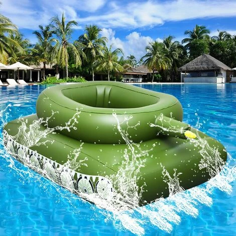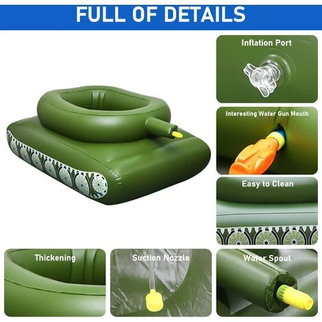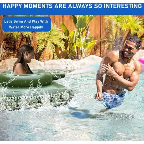 C’est un flotteur de réservoir et il peut tirer de l’eau. Profitez de la bataille d’eau et mettez-vous à l’abri contre le réservoir gonflable pour vous protéger.Dominez la piscine cet été avec ce réservoir gonflé géant. Jouet de piscine gonflable parfait pour cet été. Commencez votre ultime bataille d’eau avec vos amis et votre famille. Il sera préférable d’avoir plus d’un flotteur de réservoir, car c’est la bataille de la fête de la piscine. Il peut être utilisé dans les piscines, les rivières, les lacs et les océans. Confortable pour s’adapter à un enfant, un adolescent ou un adulte à l’intérieur. Il est également livré avec un tuyau qui se fixe directement au canon et tire l’eau de la piscine pour faire exploser vos ennemis avec des tonnes d’eau. Notre flotteur de piscine gonflable est fabriqué à partir de vinyle durable et est sûr de résister aux combats d’eau les plus durs. Facile à gonfler avec pompe à air. Il mesure environ 61 pouces de long, 44 pouces de large et 24 pouces de haut lorsqu’il est complètement gonflé. Capacité de poids jusqu’à 300 livres.