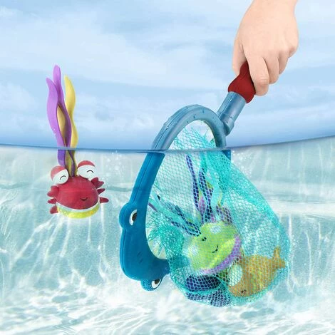 Mettez les 4 jouets de plongée lestés dans la piscine et plongez avec le filet en filet !