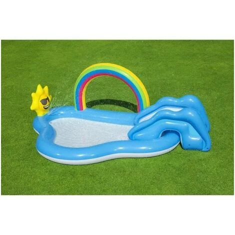 Aire de jeux avec pataugeoire Rainbow ‘n Shine 257 x 145 x 91 cm Jet d’eau intégré se branchant sur le tuyau d’arrosage. Toboggan gonflable amovible. Sol matelassé pour un atterrissage en douceur. Pataugeoire extra large. Valve de drainage intégrée. Patch de réparation.