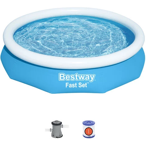Ce set de piscine Bestway Fast Set 10 ft se compose d’une piscine ronde d’un diamètre de 305 cm et d’une hauteur de 66 cm, d’une pompe à filtre Flowclear, d’une cartouche de filtre et d’un kit de réparation. Les parois de la piscine Best Way Fast Set sont fabriquées en matériau DuraPlus, solide et durable, résistant aux UV et au chlore. La piscine hors-sol Bestway Fast Set s’installe facilement et rapidement en trois étapes. 1. Placez la piscine sur une surface plane. 2. Gonflez l’anneau supérieur. 3. Remplissez la piscine d’eau. La piscine va maintenant s’élever automatiquement. Ainsi, en un rien de temps, vous aurez une piscine ronde dans votre jardin et pourrez vous rafraîchir tout l’été dans votre piscine Bestway Fast Set. Le robinet de vidange peut être raccordé au tuyau d’arrosage afin que vous puissiez évacuer l’eau à l’endroit souhaité. La piscine ronde Bestway Fast Set est livrée sans escalier.