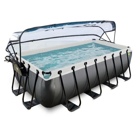 EXIT Black Leather zwembad 400x200x100cm met zandfilterpomp en overkapping en warmtepomp – zwart Het EXIT Black Leather zwembad 400 x 200 x 100 cm is een rechthoekig frame zwembad met overkapping. Dit zwembad met een zwarte leren print is standaard voorzien van een zandfilterpomp, een warmtepomp en een zwembadtrap, waarmee je veilig het zwembad in en uit kunt stappen. Met het frame zwembad van EXIT Toys beleef je gegarandeerd de leukste wateravonturen in je eigen tuin! Steel de show met de zwembaden van EXIT Toys Het EXIT Black Leather zwembad heeft een luxe uitstraling dankzij het unieke leerpatroon. Door de zwarte buitenkant en lichtgrijze binnenkant staat er een stijlvol en modern zwembad in de tuin. Het EXIT zwembad is uitgevoerd met sterke 3-laags wanden van PVC en polyester voor optimale stevigheid. Met dit luxe zwembad beleef je altijd het vakantiegevoel bij huis! Multifunctionele zwembadoverkapping Met de EXIT overkapping voor zwembaden ben je niet langer afhankelijk van de weersvoorspellingen. De overkapping zorgt ervoor dat er geen vuil meer in het water kan komen en is tegelijkertijd een duurzame oplossing voor het verwarmen van je water, want de warmte van de zon wordt onder de kap vastgehouden. De overkapping is transparant en zeer eenvoudig te openen door geïntegreerde gasdrukveren. Ook heeft de overkapping vier opvouwbare ramen. Kortom: in weer en wind genieten van je zwembad. Hoogwaardige zwembad accessoires Bij het EXIT Black Leather zwembad worden verschillende accessoires geleverd. Zo reinigt de zandfilterpomp de kleinste deeltjes uit het zwembad door het water krachtig door het filterbed heen te pompen. Dit zorgt ervoor dat vuil, zoals zand, ongedierte of algen achter blijven in het filter. En de meegeleverde warmtepomp maakt dit zwembad helemaal af. De warmtepomp wordt aangesloten op de zandfilterpomp en kan het water tot maar liefst 40 graden verwarmen. De hoogwaardige zandfilterpomp en de compacte warmtepomp zijn een echte toevoeging aan je zwembad en bezorgen je vanaf het begin van het seizoen urenlang zwemplezier. Stabiel en sterk! Het frame zwembad is niet alleen uniek, maar ook stabiel en sterk. Het stalen zwarte frame van het zwembad is extra dik met een diameter van 50 mm en de frame-poten zorgen voor optimale stabiliteit, zodat het zwembad altijd stevig blijft staan. Natuurlijk is er ook aan duurzaamheid gedacht: het zwarte frame is gegalvaniseerd en gepoedercoat zodat roest geen kans maakt. Het Duplex Coating Systeem noemen we dat bij EXIT Toys. Tijd voor een frisse duik in je eigen EXIT zwembad in de tuin! EXIT tip: voor extra reiniging wordt het gebruik van chloortabletten aanbevolen.