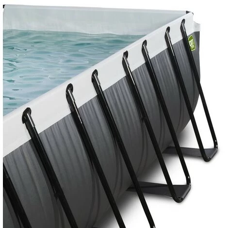 EXIT Black Leather zwembad 400x200x100cm met zandfilterpomp – zwart Het EXIT Black Leather zwembad 400 x 200 x 100 cm is een rechthoekig frame zwembad met een zwarte leren print. Het zwembad is standaard voorzien van een zandfilterpomp en een zwembadtrap, waarmee je veilig het zwembad in en uit kunt stappen. Met het frame zwembad van EXIT Toys beleef je gegarandeerd de leukste wateravonturen in je eigen tuin! Een frisse duik in je zwembad! Het EXIT Black Leather zwembad heeft een luxe uitstraling dankzij het unieke leerpatroon. Door de zwarte buitenkant en lichtgrijze binnenkant staat er een stijlvol en modern zwembad in de tuin. Het EXIT zwembad is uitgevoerd met sterke 3-laags wanden, van PVC en polyester. Het meegeleverde watercirculatiesysteem maakt dit zwembad helemaal af. De hoogwaardige zandfilterpomp reinigt de kleinste deeltjes uit het zwembad door het water krachtig door het filterbed heen te pompen. Dit zorgt ervoor dat vuil, zoals zand, ongedierte of algen achterblijven in het filter. Stabiel en sterk! Het frame zwembad is niet alleen uniek, maar ook stabiel en sterk. Het stalen zwarte frame van het zwembad is extra dik met een diameter van 50 mm en de frame-poten zorgen voor optimale stabiliteit, zodat het zwembad altijd stevig blijft staan. Natuurlijk is er ook aan duurzaamheid gedacht: het zwarte frame is gegalvaniseerd en gepoedercoat zodat roest geen kans maakt. Het Duplex Coating Systeem noemen we dat bij EXIT Toys. Tijd voor een frisse duik in je eigen EXIT zwembad in de tuin! EXIT tip: voor extra reiniging wordt het gebruik van chloortabletten aanbevolen.