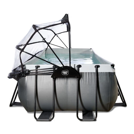 EXIT Black Leather zwembad 540x250x100cm met zandfilterpomp en overkapping – zwart Het EXIT Black Leather zwembad 540 x 250 x 100 cm is een rechthoekig frame zwembad met een zwarte leren print en overkapping. Het grote zwembad is standaard voorzien van een zandfilterpomp en een zwembadtrap, waarmee je veilig het zwembad in en uit kunt stappen. De frame zwembaden met overkapping van EXIT Toys zijn multifunctioneel, duurzaam en dé perfecte oplossing voor wisselvallig zomerweer! Een frisse duik in je zwembad! Het EXIT Black Leather zwembad heeft een luxe uitstraling dankzij het unieke leerpatroon. Door de zwarte buitenkant en lichtgrijze binnenkant staat er een stijlvol en modern zwembad in de tuin. Het EXIT zwembad is uitgevoerd met sterke 3-laags wanden, van PVC en polyester. Het meegeleverde watercirculatiesysteem maakt dit zwembad helemaal af. De hoogwaardige zandfilterpomp reinigt de kleinste deeltjes uit het zwembad door het water krachtig door het filterbed heen te pompen. Dit zorgt ervoor dat vuil, zoals zand, ongedierte of algen achter blijven in het filter. Multifunctionele zwembadoverkapping Met de EXIT overkapping voor zwembaden ben je niet langer afhankelijk van de weersvoorspellingen. De overkapping zorgt ervoor dat er geen vuil meer in het water kan komen en is tegelijkertijd een duurzame oplossing voor het verwarmen van je water, want de warmte van de zon wordt onder de kap vastgehouden. De overkapping is transparant en zeer eenvoudig te openen door geïntegreerde gasdrukveren. Ook heeft de overkapping vier opvouwbare ramen. Kortom: in weer en wind genieten van je zwembad. Stabiel en sterk! Het frame zwembad is niet alleen uniek, maar ook stabiel en sterk. Het stalen zwarte frame van het zwembad is extra dik met een diameter van 50 mm en de frame-poten zorgen voor optimale stabiliteit, zodat het zwembad altijd stevig blijft staan. Natuurlijk is er ook aan duurzaamheid gedacht: het zwarte frame is gegalvaniseerd en gepoedercoat zodat roest geen kans maakt. Het Duplex Coating Systeem noemen we dat bij EXIT Toys. Tijd voor een frisse duik in je eigen EXIT zwembad in de tuin! EXIT tip: voor extra reiniging wordt het gebruik van chloortabletten aanbevolen.