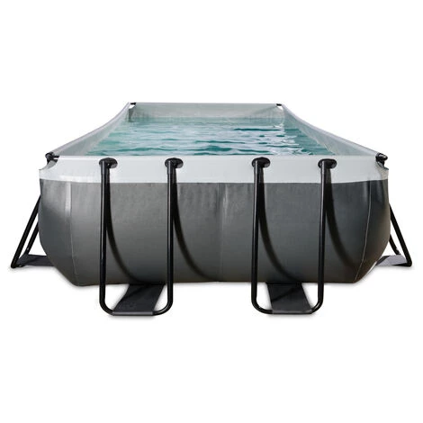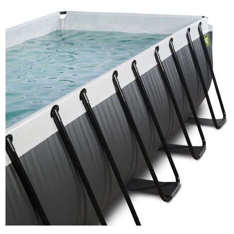 EXIT Black Leather zwembad 540x250x100cm met zandfilterpomp – zwart Het EXIT Black Leather zwembad 540 x 250 x 100 cm is een rechthoekig frame zwembad met een zwarte leren print. Het grote zwembad is standaard voorzien van een zandfilterpomp en een zwembadtrap, waarmee je veilig het zwembad in en uit kunt stappen. Met het frame zwembad van EXIT Toys beleef je gegarandeerd de leukste wateravonturen in je eigen tuin! Een frisse duik in je zwembad! Het EXIT Black Leather zwembad heeft een luxe uitstraling dankzij het unieke leerpatroon. Door de zwarte buitenkant en lichtgrijze binnenkant staat er een stijlvol en modern zwembad in de tuin. Het EXIT zwembad is uitgevoerd met sterke 3-laags wanden, van PVC en polyester. Het meegeleverde watercirculatiesysteem maakt dit zwembad helemaal af. De hoogwaardige zandfilterpomp reinigt de kleinste deeltjes uit het zwembad door het water krachtig door het filterbed heen te pompen. Dit zorgt ervoor dat vuil, zoals zand, ongedierte of algen achterblijven in het filter. Stabiel en sterk! Het frame zwembad is niet alleen uniek, maar ook stabiel en sterk. Het stalen zwarte frame van het zwembad is extra dik met een diameter van 50 mm en de frame-poten zorgen voor optimale stabiliteit, zodat het zwembad altijd stevig blijft staan. Natuurlijk is er ook aan duurzaamheid gedacht: het zwarte frame is gegalvaniseerd en gepoedercoat zodat roest geen kans maakt. Het Duplex Coating Systeem noemen we dat bij EXIT Toys. Tijd voor een frisse duik in je eigen EXIT zwembad in de tuin! EXIT tip: voor extra reiniging wordt het gebruik van chloortabletten aanbevolen.