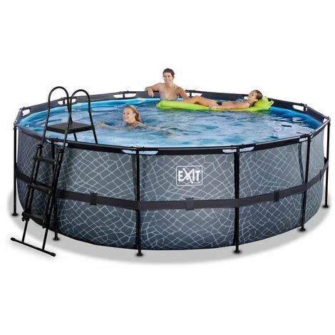 EXIT Stone zwembad ø427x122cm met filterpomp – grijs Het EXIT Stone zwembad ø427 x 122 cm is een rond, grijskleurig frame zwembad. Het zwembad is standaard voorzien van een filterpomp en een zwembadtrap, waarmee je veilig het zwembad in en uit kunt stappen. Door de grote diameter van het zwembad is er genoeg ruimte om heerlijk op een luchtbed te dobberen. En wil je toch liever onder water zwemmen? Het EXIT Stone zwembad is maar liefst 122 centimeter diep waardoor je echt onder water kunt duiken. Met het hoogwaardige frame zwembad van EXIT Toys beleef je gegarandeerd de leukste wateravonturen in je eigen tuin! Een mooi zwembad voor in je tuin Het Stone zwembad heeft een modern en stoer steenpatroon op de zijkant en is daarmee een échte blikvanger in de tuin. De binnenzijde van het zwembad is blauw, voor het frisse zwembadgevoel. Het EXIT zwembad is uitgevoerd met sterke 3-laags wanden, van pvc en polyester. De ronde vorm van het zwembad creëert een gezellige sfeer en zorgt ervoor dat je eenvoudig met meerdere personen plezier kunt beleven in het zwembad. Ontdek wie het snelst een baantje kan trekken, dobber samen rond op een luchtbed of duik speeltjes van de bodem op. Kortom: met de ronde zwembaden van EXIT Toys verveel je je geen moment. Jarenlang een frisse duik in je zwembad Ontdek hoe stevig een rond opzetzwembad kan zijn: het gepoedercoate stalen frame en de sterke poten van het EXIT Stone zwembad zorgen ervoor dat het bad altijd stabiel staat en jarenlang meegaat. De meegeleverde filterpomp houdt het water schoon en in beweging zodat vervuiling van het water wordt tegengegaan. In het EXIT Stone zwembad neem je altijd een frisse duik! Standaard inbegrepen * Zwart stalen zwembadframe ø427 x 122 cm * Grijze liner met stoer steenpatroon * Filterpomp met cartridge * Liner reparatieset * Zwembadtrap * Handleiding framebad (https://www.exittoys.nl/zwembad-o427x122cm-met-filterpomp/handleiding-zwembad-o427x122cm-met-filterpomp-db96edb0.pdf) * Handleiding pomp (https://www.exittoys.nl/zwembad-o427x122cm-met-filterpomp/handleiding-zwembad-o427x122cm-met-filterpomp-ed8d71a5.pdf) * Handleiding zwembadtrap (https://www.exittoys.nl/zwembad-o427x122cm-met-filterpomp/handleiding-zwembad-o427x122cm-met-filterpomp-94c84de3.pdf)