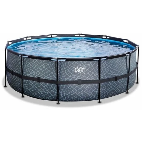 EXIT Stone zwembad ø427x122cm met zandfilterpomp – grijs Het EXIT Stone zwembad ø427 x 122 cm is een rond grijskleurig frame zwembad. Het zwembad is standaard voorzien van een zandfilterpomp en een zwembadtrap, waarmee je veilig het zwembad in en uit kunt stappen. Door de grote diameter van het zwembad is er genoeg ruimte om heerlijk op een luchtbed te dobberen. En wil je toch liever onder water zwemmen? Het EXIT Stone zwembad is maar liefst 122 centimeter diep waardoor je echt onder water kunt duiken. Met het hoogwaardige frame zwembad van EXIT Toys beleef je gegarandeerd de leukste wateravonturen in je eigen tuin! Een mooi zwembad voor in je tuin Het Stone zwembad heeft een modern en stoer steenpatroon op de zijkant en is daarmee een échte blikvanger in de tuin. De binnenzijde van het zwembad is blauw, voor het frisse zwembadgevoel. Het EXIT zwembad is uitgevoerd met sterke 3-laags wanden van pvc en polyester. De ronde vorm van het zwembad creëert een gezellige sfeer en zorgt ervoor dat je eenvoudig met meerdere personen plezier kunt beleven in het zwembad. Ontdek wie het snelst een baantje kan trekken, dobber samen rond op een luchtbed of duik speeltjes van de bodem op. Kortom: met de ronde zwembaden van EXIT Toys verveel je je geen moment. Jarenlang een frisse duik in je zwembad Ontdek hoe stevig een rond opzetzwembad kan zijn: het gepoedercoate stalen frame en de sterke poten van het EXIT Stone zwembad zorgen ervoor dat het bad altijd stabiel staat en jarenlang meegaat. En het meegeleverde watercirculatiesysteem maakt dit zwembad helemaal af. De hoogwaardige zandfilterpomp reinigt de kleinste deeltjes uit het zwembad door het water krachtig door het filterbed heen te pompen. Dit zorgt ervoor dat vuil, zoals zand, ongedierte of algen achterblijven in het filter. In het EXIT Stone zwembad neem je altijd een frisse duik! Standaard inbegrepen * Zwart stalen zwembadframe ø427 x 122 cm * Grijze liner met stoer steenpatroon * Zandfilterpomp (filtermateriaal is niet inbegrepen) * Liner reparatieset * Zwembadtrap * Handleiding framebad (https://www.exittoys.nl/zwembad-o427x122cm-met-zandfilterpomp/handleiding-zwembad-o427x122cm-met-zandfilterpomp-db96edb0.pdf) * Handleiding pomp (https://www.exittoys.nl/zwembad-o427x122cm-met-zandfilterpomp/handleiding-zwembad-o427x122cm-met-zandfilterpomp-ce4b70f4.pdf) * Handleiding zwembadtrap (https://www.exittoys.nl/zwembad-o427x122cm-met-zandfilterpomp/handleiding-zwembad-o427x122cm-met-zandfilterpomp-94c84de3.pdf)
