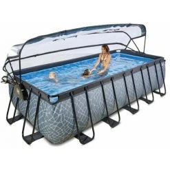 EXIT Stone zwembad 540x250x122cm met overkapping en zandfilterpomp – grijs Het EXIT Stone zwembad 540 x 250 x 122 cm is een rechthoekig grijskleurig frame zwembad met overkapping. Dit grote zwembad is standaard voorzien van een zandfilterpomp en een zwembadtrap, waarmee je veilig het zwembad in en uit kunt stappen. Het frame zwembad biedt genoeg ruimte om heerlijk op een luchtbed te dobberen. En wil je toch liever onder water zwemmen? Het EXIT Stone zwembad is maar liefst 122 centimeter diep waardoor je echt onder water kunt duiken. De frame zwembaden met overkapping van EXIT Toys zijn multifunctioneel, duurzaam en dé perfecte oplossing voor wisselvallig zomerweer! Een frisse duik in je zwembad! Het Stone zwembad heeft een modern en stoer steenpatroon op de zijkant en is daarmee een échte blikvanger in de tuin. Het EXIT zwembad is uitgevoerd met sterke 3-laags wanden van PVC en polyester en de binnenzijde van het zwembad is blauw voor het frisse zwembadgevoel. Het zwembad is geschikt voor maar liefst negen personen en omdat het zwembad diep is, kun je ook baantjes trekken en onder water duiken. Het meegeleverde watercirculatiesysteem maakt dit zwembad helemaal af. De hoogwaardige zandfilterpomp reinigt de kleinste deeltjes uit het zwembad door het water krachtig door het filterbed heen te pompen. Dit zorgt ervoor dat vuil, zoals zand, ongedierte of algen achter blijven in het filter. Multifunctionele zwembadoverkapping Met de EXIT overkapping voor zwembaden ben je niet langer afhankelijk van de weersvoorspellingen. De overkapping zorgt ervoor dat er geen vuil meer in het water kan komen en is tegelijkertijd een duurzame oplossing voor het verwarmen van je water, want de warmte van de zon wordt onder de kap vastgehouden. De overkapping is transparant en zeer eenvoudig te openen door geïntegreerde gasdrukveren. Ook heeft de overkapping drie opvouwbare ramen en een deur. Kortom: in weer en wind genieten van je zwembad. Stabiel en sterk! Het frame zwembad is niet alleen uniek, maar ook stabiel en sterk. Het stalen zwarte frame van het zwembad is extra dik met een diameter van 50 mm en de frame-poten zorgen voor optimale stabiliteit, zodat het zwembad altijd stevig blijft staan. Natuurlijk is er ook aan duurzaamheid gedacht: het zwarte frame is gegalvaniseerd en gepoedercoat zodat roest geen kans maakt. Het Duplex Coating Systeem noemen we dat bij EXIT Toys. Tijd voor een frisse duik in je eigen EXIT zwembad in de tuin! Standaard inbegrepen – Zwart stalen zwembadframe 540 x 250 x 122 cm – Grijze liner met stoer steenpatroon – Overkapping met drie ramen en een deur 585 x 270 cm- Inclusief zandfilterpomp (zand is niet inbegrepen) – Inclusief trapje Inclusief liner reparatieset – Handleiding framebad- Handleiding pomp – Handleiding ladder- Handleiding Overkapping EXIT tip: voor extra reiniging wordt het gebruik van chloortabletten aanbevolen.