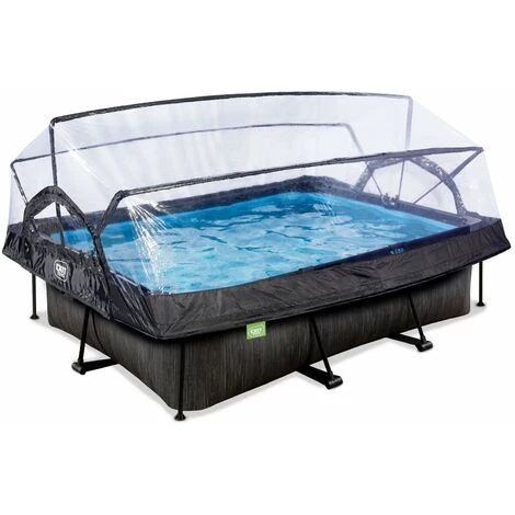 La piscine EXIT Black Wood 220 x 150 x 65 cm est une piscine tubulaire rectangulaire avec dôme. La piscine est équipée d’une pompe filtrante et se distingue des autres piscines par son élégant motif imitation bois sombre. Découvre la stabilité d’une piscine rectangulaire: la cadre en acier thermolaquée et les coins forts de la piscine EXIT Black Wood garantissent la stabilité et la longévité de la piscine. La pompe filtrante incluse conserve l’eau propre et en mouvement afin d’éviter sa contamination.Avec le dôme de piscine EXIT, tu ne dépends plus de la météo. Le dôme assure qu’aucune saleté ne tombe dans l’eau et constitue également une solution durable pour le chauffage de l’eau, car la chaleur du soleil est retenue sous le dôme. Le dôme est très facile à ouvrir et à fermer grâce à son mécanisme de charnière unique et la toile transparente ne cache rien de ce qui se passe à l’extérieur de la piscine.L’élégante finition en imitation bois procure à la piscine Black Wood un aspect unique. Grâce à cette allure naturelle, la piscine s’intègrera parfaitement dans ton jardin. L’intérieur de la piscine est bleu, pour une sensation de fraîcheur intemporelle. La piscine a un cadre bas et est donc facile d’accès pour les plus petits.