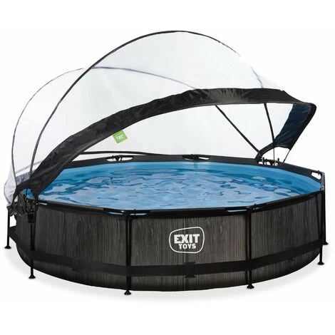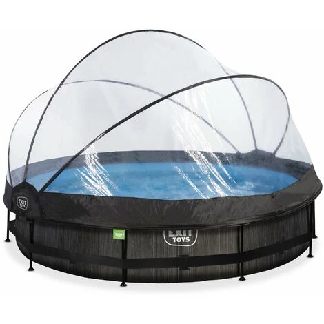 La piscine EXIT Black Wood ø360x76cm est une piscine tubulaire ronde avec dôme. La piscine est équipée d’une pompe filtrante et se distingue des autres piscines par son élégant motif imitation bois sombre. Découvre la stabilité d’une piscine ronde: la cadre en acier thermolaquée et les pieds robustes de la piscine EXIT Black Wood garantissent la stabilité et la longévité de la piscine. La pompe filtrante incluse conserve l’eau propre et en mouvement afin d’éviter sa contamination.Avec le dôme de piscine EXIT, tu ne dépends plus de la météo. Le dôme assure qu’aucune saleté ne tombe dans l’eau et constitue également une solution durable pour le chauffage de l’eau, car la chaleur du soleil est retenue sous le dôme. Le dôme est très facile à ouvrir et à fermer grâce à son mécanisme de charnière unique et la toile transparente ne cache rien de ce qui se passe à l’extérieur de la piscine.L’élégante finition en imitation bois procure à la piscine Black Wood un aspect unique. Grâce à cette allure naturelle, la piscine s’intègrera parfaitement dans ton jardin. L’intérieur de la piscine est bleu, pour une sensation de fraîcheur intemporelle.