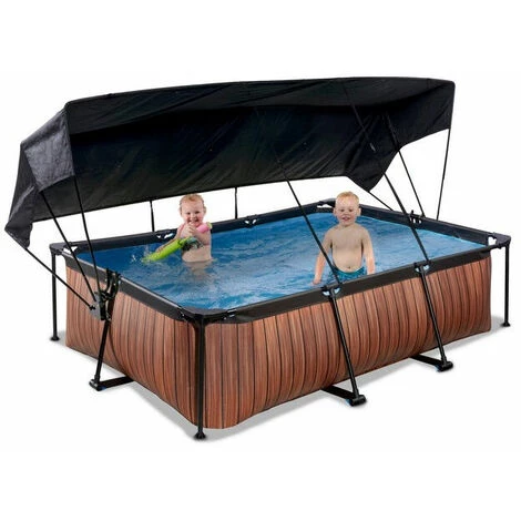 La piscine EXIT Wood 220 x 150 x 65 cm est une piscine tubulaire rectangulaire, de couleur marron. La piscine est équipée d’une pompe filtrante et d’un voile d’ombrage, qui te protège du soleil en été. Découvre la stabilité d’une piscine rectangulaire: la cadre en acier thermolaquée et et les coins forts de la piscine EXIT Wood garantissent la stabilité et la longévité de la piscine. La pompe filtrante incluse conserve l’eau propre et en mouvement afin d’éviter sa contamination. Le voile d’ombrage unique d’EXIT Toys offre une protection optimale contre le soleil. Grâce au système d’éventail convivial, tu crées de l’ombre, recouvrant partiellement ou entièrement ta piscine en un tour de main, de sorte que tu puisses également te baigner de façon insouciante, en plein soleil. Grâce aux sangles réglables, tu peux bouger le voile d’ombrage au fur et à mesure du déplacement des rayons du soleil et le fixer à n’importe quelle hauteur. Le voile d’ombrage a un design élégant et une finition de grande qualité. L’élégante finition en imitation bois procure à la piscine Wood un aspect unique. Grâce à cette allure naturelle, la piscine s’intègrera parfaitement dans ton jardin. L’intérieur de la piscine est bleu, pour une sensation de fraîcheur intemporelle. La piscine a un cadre bas et est donc facile d’accès pour les plus petits.
