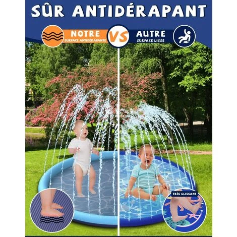 【Matériau sûr et durable】Ce tapis jet d’eau enfant est fabriqué en PVC de haute qualité de 0,5 mm d’épaisseur sans BPA ni phtalates. Motifs antidérapants pour empêcher les animaux de compagnie et les enfants de glisser. Plus sûr! Les enfants se rapprochent de la nature et profitent du merveilleux été. 〔Conseil: évitez les frottements / contacts excessifs avec des objets tranchants pendant l’utilisation. Manucure pour animaux de compagnie avant d’utiliser le produit〕