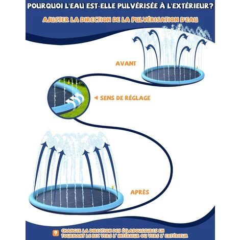 【Hauteur et direction de pulvérisation réglables】Posez à plat la tapis jet d’eau enfant, connectez avec un tuyau d’arrosage, puis ajustez la pression de l’eau pour abaisser ou augmenter la hauteur de pulvérisation. Changez la direction de la pulvérisation d’eau en tournant les becs vers l’extérieur ou vers l’intérieur. Ensuite, vous êtes prêt à profiter de jeux aquatiques amusants
