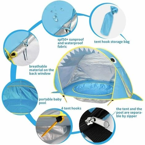 GRID COOL Piscine Enfant Tente De Plage Pour Bébé Blue-Pop Up Avec Piscine, Tente Abri Solaire Requin Portable Avec Protection UPF UV 50+ Pour Tout-petit âgé De 3 à 72 Mois