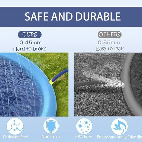 Matériel sûr et durable – Votre petite sécurité est notre priorité absolue, ce tampon d’arrosage hydrique pour les enfants et les chiens est constitué de matériau en PVC environnemental, antidérapant et exempt de BPA et de phtalates, sans danger pour une utilisation quotidienne, une épaisseur de 0,45 mm est de 30%. Plus épais que celle des autres tampons anti-éclaboussures, une technologie de scellement de bord de haute qualité ne permet pas d’éclater.