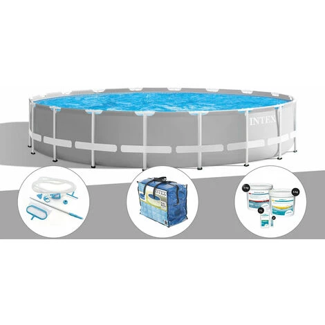 Piscine tubulaire Prism Frame ronde 5,49 x 1,22 m – Intex. Liner en PVC armé triple épaisseur gris clair.Accessoires inclus :