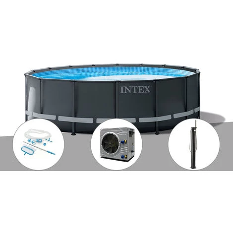 Kit Piscine Tubulaire Intex Ultra XTR Frame Ronde 4,88 X 1,22 M + Kit D’entretien + Pompe à Chaleur + Douche Solaire – Gris