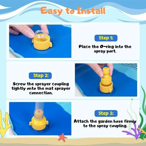 Installation facile : connectez la vanne d’arrivée d’eau à votre tuyau d’arrosage standard et réglez la pression de l’eau pour abaisser ou augmenter la hauteur de pulvérisation. Veuillez utiliser un tuyau d’eau à pression normale, n’utilisez pas de tuyaux à haute pression pendant une longue période pour éviter que le tapis n’éclate.