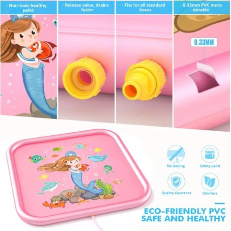 【Tapis d’eau durable et sûr】 Ce tapis de jeu pour arroseur est fabriqué en PVC écologique importé de 0,33 mm d’épaisseur, ne nuira pas à la santé des enfants. Le jouet d’arrosage 22% plus épais que la normale est résistant et durable, empêche les trous et les dommages, veuillez noter que le motif est imprimé à l’encre, il y aura une petite odeur. Veuillez le laisser sécher dans un endroit ventilé pendant 1 à 2 jours.