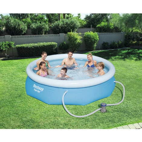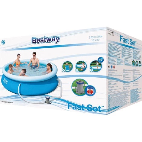 Ce set de piscine Bestway Fast Set comprend une piscine ronde d’un diamètre de 305 cm, une pompe à filtre Flowclear, une cartouche de filtre et un kit de réparation. Les parois de la piscine Best Way Fast Set sont fabriquées en matériau TriTech solide et durable, résistant aux UV et au chlore. La piscine hors-sol Bestway Fast Set s’installe facilement et rapidement en trois étapes. 1. Placez la piscine sur une surface plane. 2. Gonflez l’anneau supérieur. 3. Remplissez la piscine d’eau. La piscine va maintenant s’élever automatiquement. Ainsi, en un rien de temps, vous aurez une piscine ronde dans votre jardin et pourrez vous rafraîchir tout l’été dans votre piscine Bestway Fast Set. Le robinet de vidange peut être raccordé au tuyau d’arrosage afin que vous puissiez évacuer l’eau à l’endroit souhaité. La piscine ronde Bestway Fast Set est livrée sans escalier.