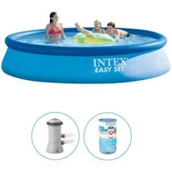 L’Intex Easy Set 396×84 cm, pompe de filtration incluse, est une piscine adaptée aux enfants et très facile à installer. Cette piscine gonflable ronde peut accueillir 8 personnes, est de couleur bleu vif et est prête à la baignade en 10 minutes. La piscine est équipée d’un solide liner à trois couches, le risque de dommages est donc très faible. La couche intérieure est en polyester et est donc adaptée aux enfants.