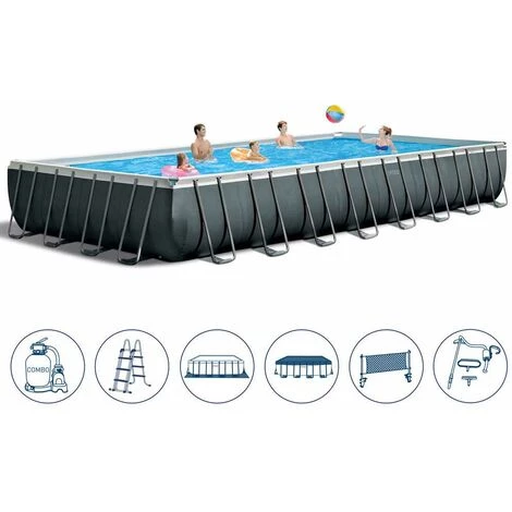 Piscine hors-sol rectangulaire Intex 26378 Ultra Frame Extra-large full option avec échelle, un générateur de chlore, bâches de couverture, kit de nettoyage deluxe avec aspirateur inclus et le set volley-ball pour s’amuser avec les amis et organiser des fêtes à la maison.