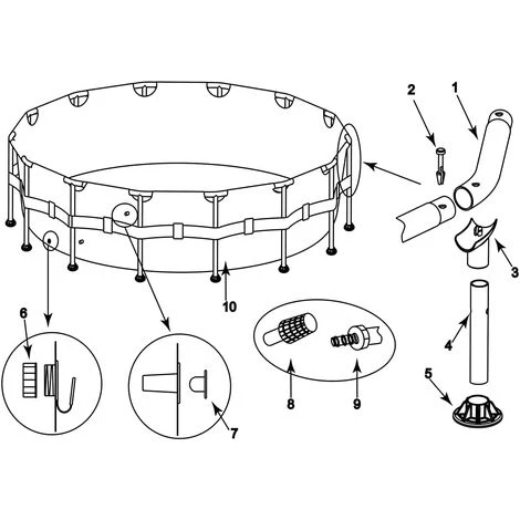 - Connexions pour double circulation:La piscine est équipée de 2 connexions de filtre. Celles-ci permettent à toute pompe de filtration d’un diamètre de 32 mm d’être connectée à la piscine. En connectant une pompe de filtration aux raccords de circulation, la qualité de l’eau peut être améliorée afin que l’eau de la piscine soit plus hygiénique. (Ce produit ne contient pas de pompe de filtration. Veuillez acheter une pompe de filtration d’une capacité de 300 gallons)