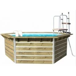 Piscine bois hors sol, semi-enterrée ou enterrée. Margelle en bois, pin traité au Thanalit. Structure panneau associant bois et aluminium. Groupe de filtration à sable et pompe d’un débit de 4m3/h. Liner 42,5/100eme.